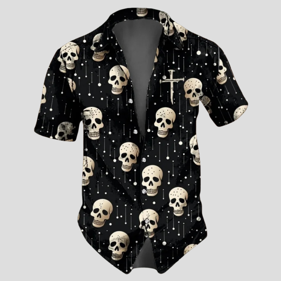 Schwarzes Punk-Hemd mit Totenköpfen und Kreuzen Kurzarm