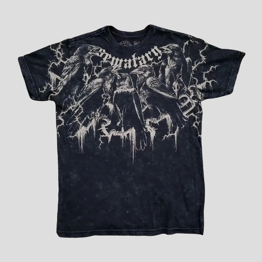 Schwarzes Punk-Metal-T-Shirt mit Raben und Schriftzug