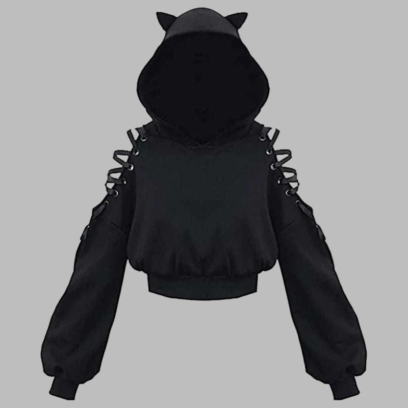 Schwarzes Punk-Sweatshirt mit Hörnern und Schnürung an den Schultern