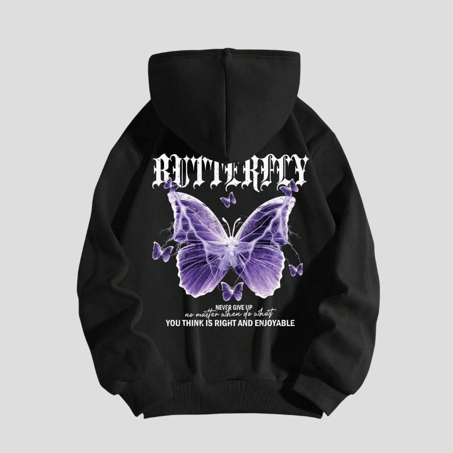 Schwarzes Punk-Sweatshirt mit violetten Schmetterlingen und Schriftzug