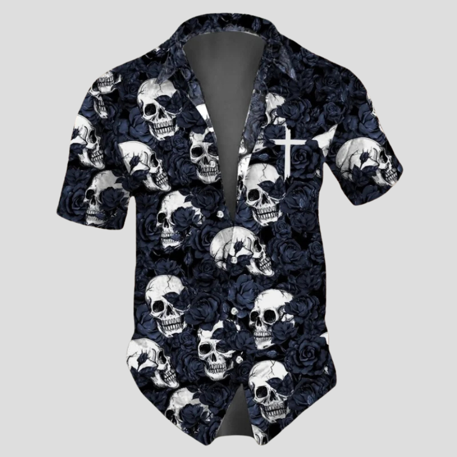 Schwarzes Rock-Hemd mit Totenköpfen und Rosen, Kurzarm