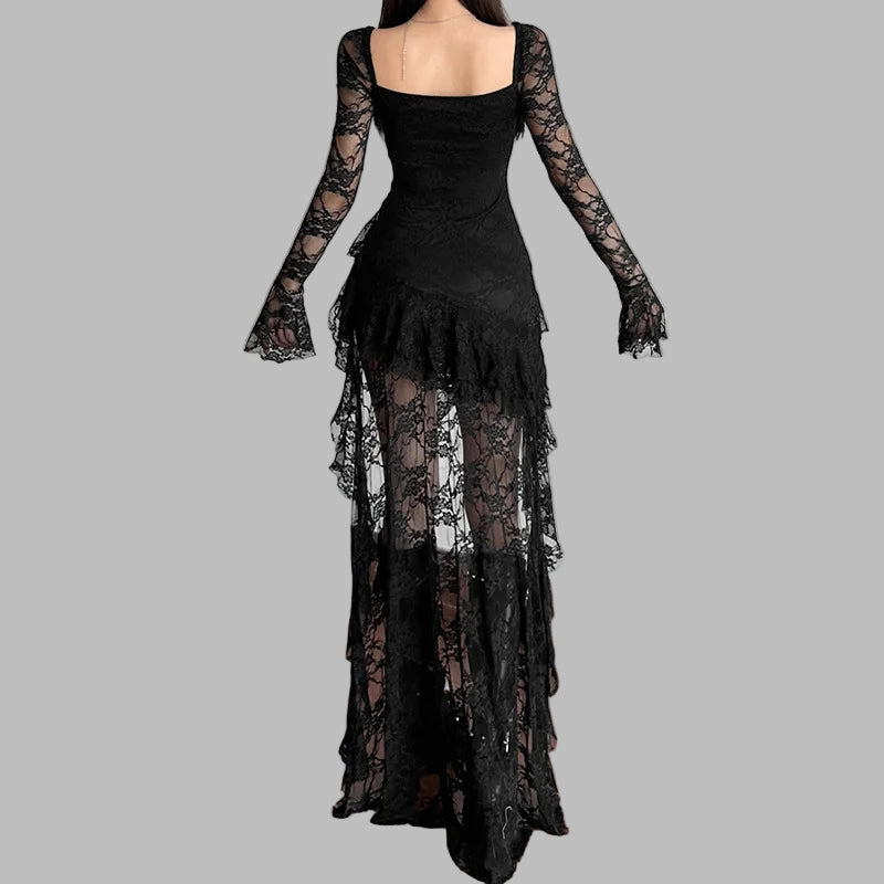 Schwarzes Rockkleid mit Spitze und asymmetrischem Saum