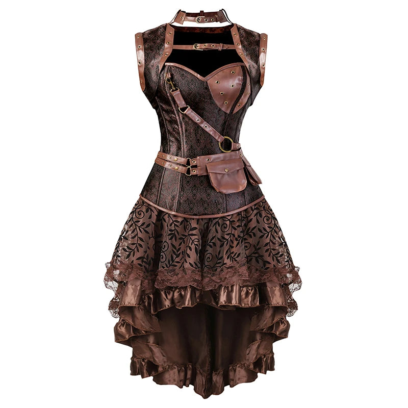 Steampunk-Kleid mit braunem Korsett und asymmetrischem Rock 6XL