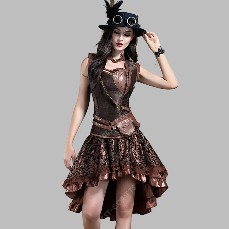 Steampunk-Kleid mit braunem Korsett und asymmetrischem Rock