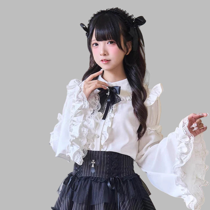 Weiße gotische Bluse mit schwarzer Spitze und Schleife Jirai Kei Lolita