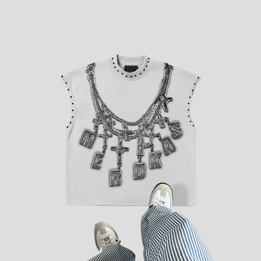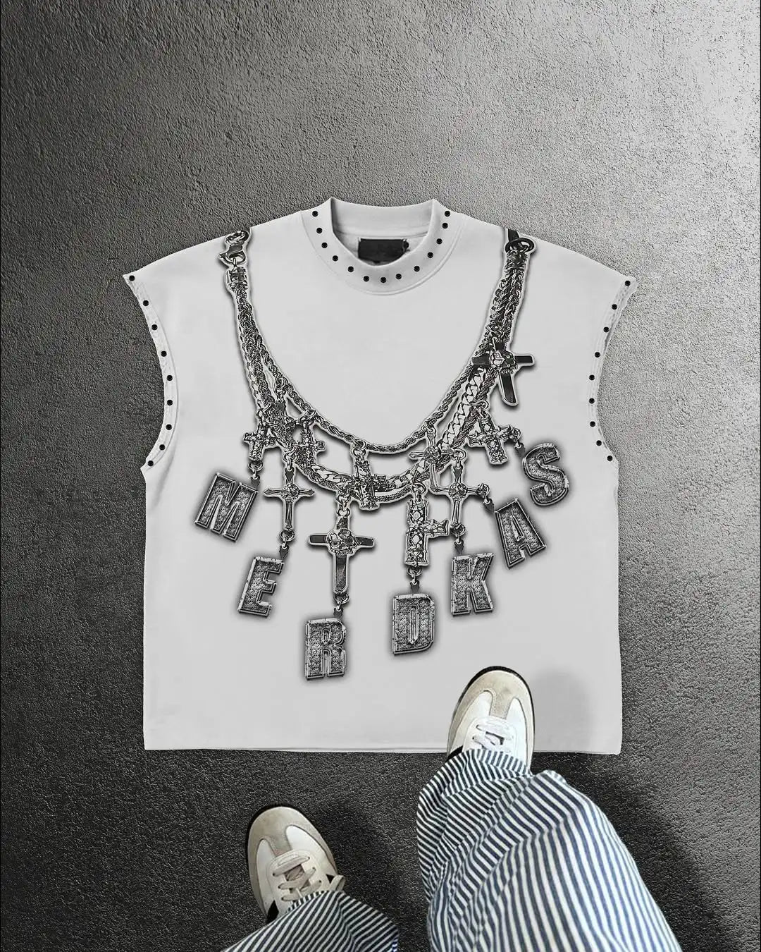 Weißes Punk-T-Shirt mit Metallketten-Grafik