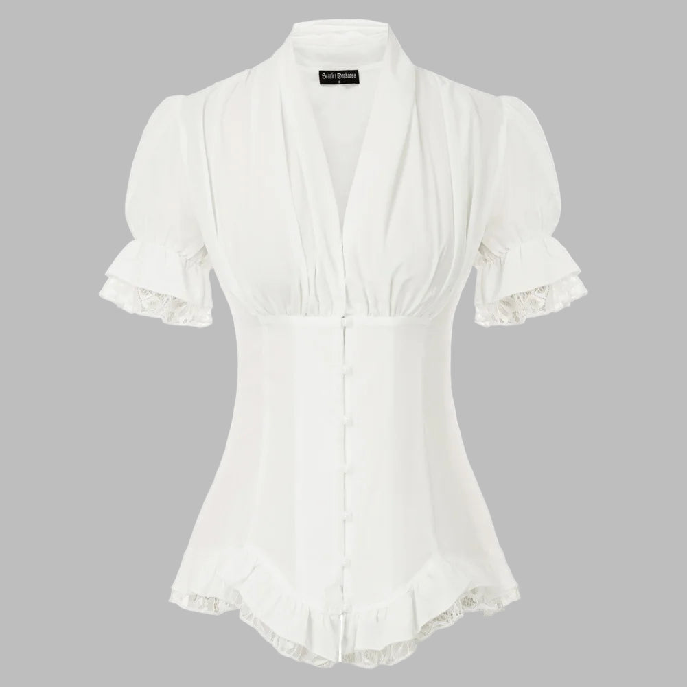 Weiße Steampunk-Bluse mit Spitze und kurzen Ärmeln